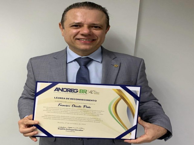 Próximo de completar três anos como presidente da Associação dos Notários e Registradores do Ceará (Anoreg-CE), em junho deste ano, Cláudio Pinho tem como marca de sua gestão as pautas que valorizam a categoria e o andamento de projetos e programas voltados para a sociedade. Em reconhecimento ao trabalho desenvolvido no estado, a entidade nacional concedeu uma honraria ao notário e titular de cartório em São Gonçalo do Amarante (CE), Cláudio Pinho, como parte das comemorações pelos 40 anos de existência da Anoreg-BR.